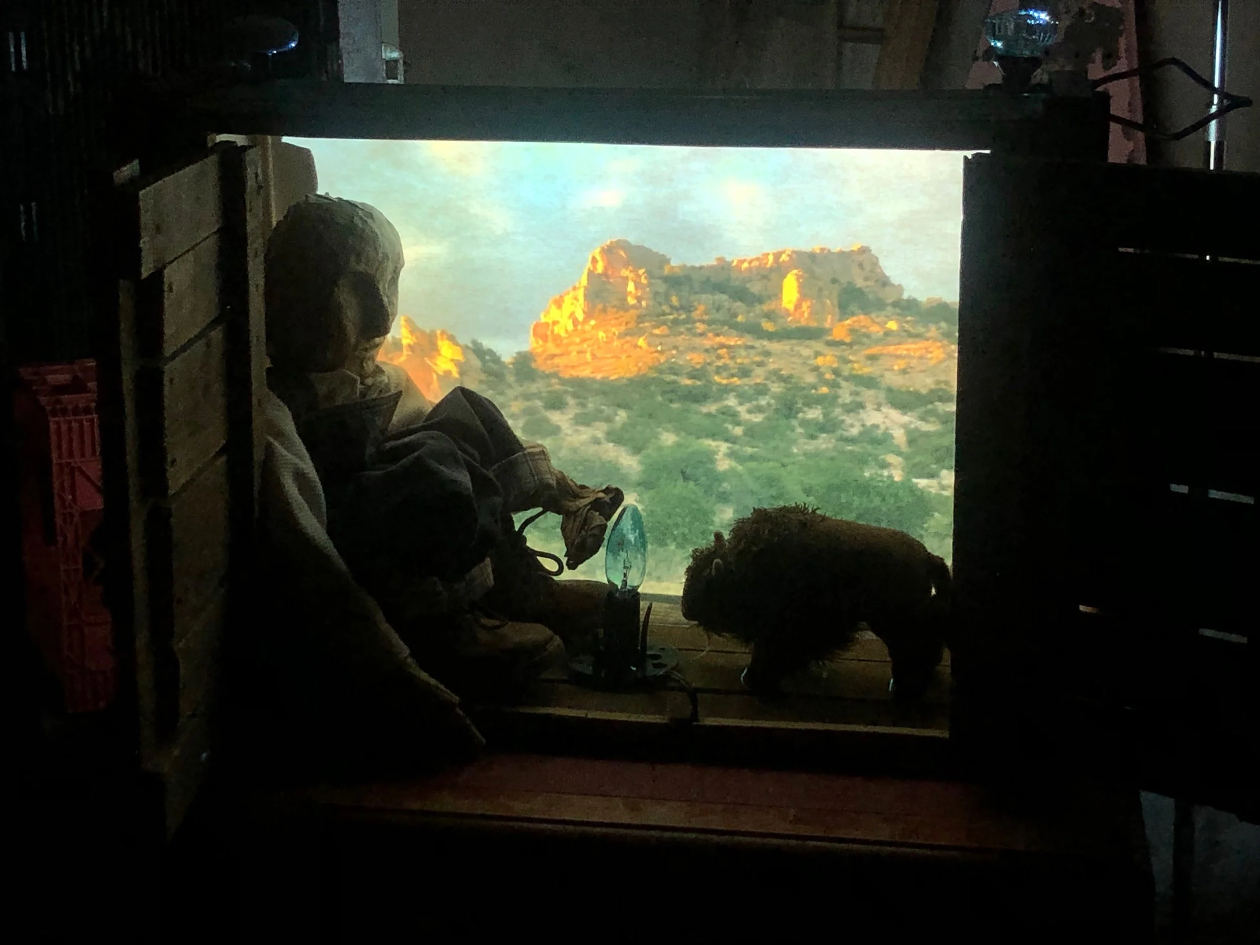 An intimate community play circle where the audience can animate the puppets (boy & bison), share stories and pass objects (water, train) around to create their own unique one-time version of the story.